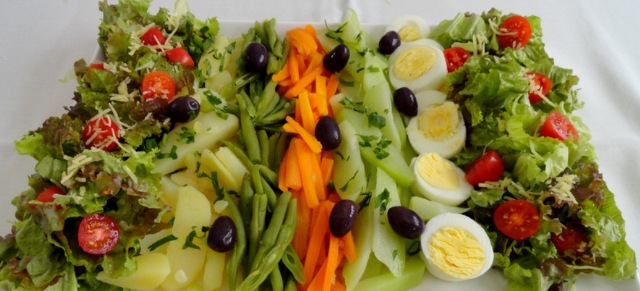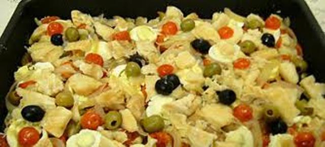 Salada de bacalhau kg R$ 95,00 (bacalhau,batata,couve, ovos de codorna, azeitona preta,cebola e salsa)